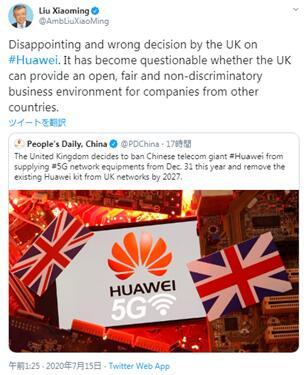 中國駐英國大使劉曉明表示,朝令夕改、禁用華為不僅會損害英國標榜的開放、宜商、自由、透明的形象,也將損害英國獨立自主的國家形象。
