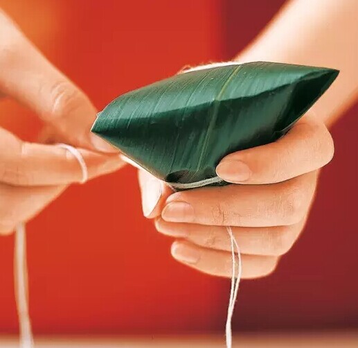 ?用繩子環(huán)繞粽子四面數(shù)圈,將粽子緊緊裹住,并在粽腰處扎緊打結(jié)。(此步驟非常重要,如果繩子捆得不夠結(jié)實(shí),在煮制過程中粽葉會有松開的可能,這樣就前功盡棄了)