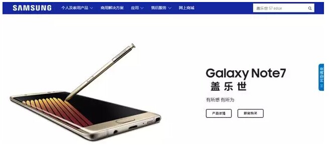 目前,在中國(guó)的三星官網(wǎng)上,Note7還仍作為主推商品,在首頁(yè)最醒目的地方。