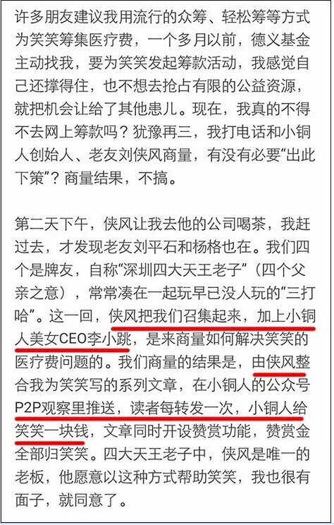 除了用這篇文章的打賞功能籌集醫(yī)療費,一家名為“小銅人”的機構介入也助推此事變成朋友圈刷屏的熱點。