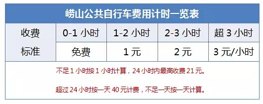 注:持嶗山登山年卡的市民,在辦理并預(yù)存過金額之后,使用公共自行車時(shí)可享受5小時(shí)內(nèi)免費(fèi)的優(yōu)惠政策,5小時(shí)后,按普通自行車租賃卡的收費(fèi)標(biāo)準(zhǔn)計(jì)費(fèi)。