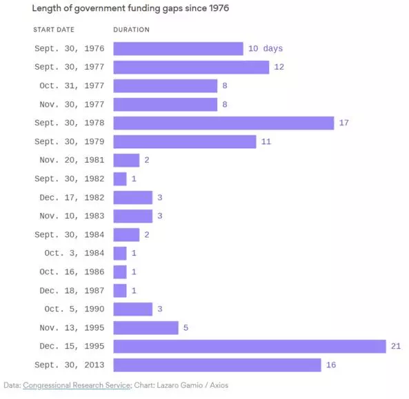 ▲1976年以來美國歷次政府關門時長