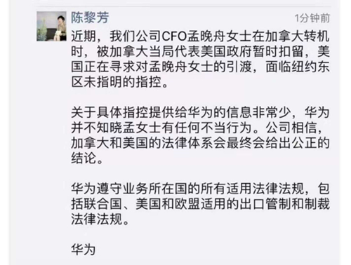 對此,華為董事、高級副總裁陳黎芳在朋友圈回應(yīng)確有此事。她表示,近期,公司CFO孟晚舟女士在加拿大轉(zhuǎn)機(jī)時(shí),被加拿大當(dāng)局代表美國政府暫時(shí)扣留,美國正在尋求對孟晚舟女士的引渡,面臨紐約東區(qū)未指名的指控。