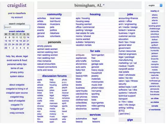 我通常用Craigslist的案例來分析。正如上圖你所看到的,這個(gè)網(wǎng)站的主頁就是一堆藍(lán)色的文字鏈,設(shè)計(jì)者把他們按照一定的分類進(jìn)行排放,這種設(shè)計(jì)就像1999年互聯(lián)網(wǎng)剛開始興起時(shí)的風(fēng)格樣式。