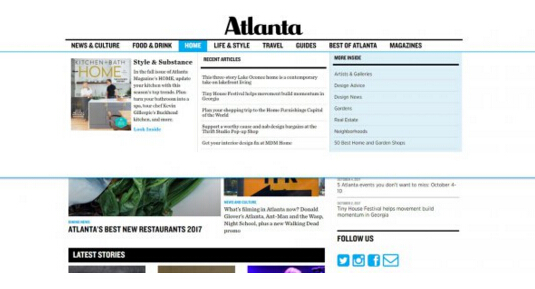 Atlanta Magazine 的大型導(dǎo)航菜單給人的體驗(yàn)就非常流暢,下拉菜單中嵌入了大量的鏈接。由于響應(yīng)式的滑動(dòng)導(dǎo)航在移動(dòng)端上也已經(jīng)很常見了,這使得它還輕松兼顧到了移動(dòng)端的設(shè)計(jì)。